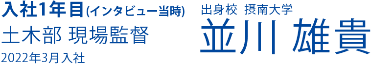 昔から建造物に興味があり、将来は建物の土台を作る仕事につきたいと思っていました。大学卒業後は設計会社で土木工事の積算補助、測量会社での現場測量経験を経て森髙建設へ。奈良県内で幅広く土木一式工事を手掛けており、いろんな経験が積めると思い入社を決めました。また、採用活動では自社の良いところばかりを見せようとする会社が多い中、森髙建設は課題を含め、ありのままを話してくれたんです。採用担当の方の対応にも誠意を感じ、正直な会社だなと好感が持てました。